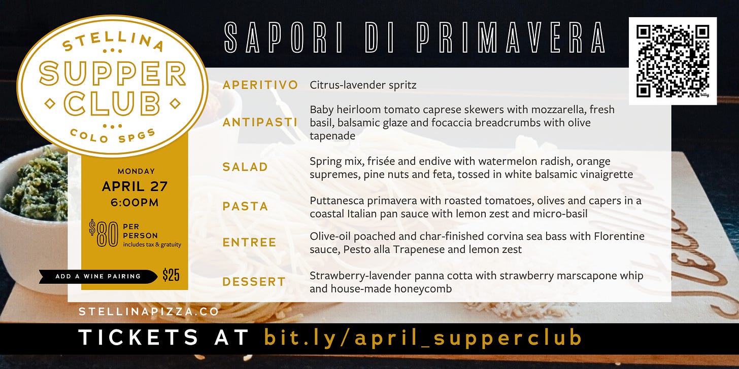 April 28: Passport To Castello Banfi wine dinner at Pizzeria Rustica. 6 p.m.; $89 for five paired courses, call 719-475-9700 to reserve.