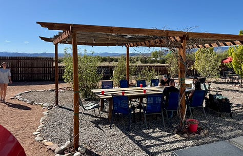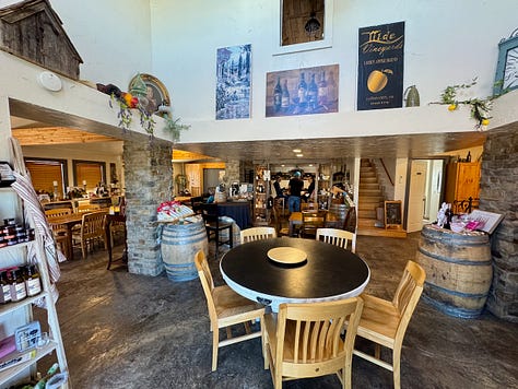 Winemaker Robert Vanatta (pictured above) guides us through our wine flight we’ve selected — watch the one-minute clip I filmed here — which includes some wines that earned medals at the Governor’s Cup in recent years. I won’t go through our tasting notes wine by wine (because he already covers descriptors in that video clip), but I can tell you we like the Syrah a lot; enjoyed the Aromella’s tropical elements; were challenged by the Maréchal Foch (aged in Axe and the Oak bourbon barrels, taking on a brown color and sour cherry taste with umami back notes of mushroom); and brought a bottle home of the lightly sweet Pueblo Green Chile, with a wonderful chile nose and true flavor, leaving a residual smolder in our throats.