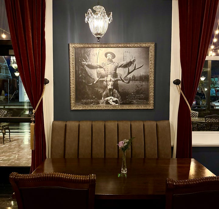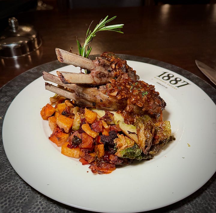 The hotel’s restoration did a great job in terms of making it feel hip and boutique. A fair comparison might be The Mining Exchange in Colorado Springs, in terms of preserving history and creating a new narrative around the thematics. So think of 1887 as like Oro. Historic photo reproductions play off frontier and Western styles; tin ceiling tiles stretch over a display case of sweets in the center of the room; and pretty charger plates hold leather-bound menus next to hotel logo pint glasses for water service. Table service rates attentive and sincere; we enjoy bantering with our waiter.