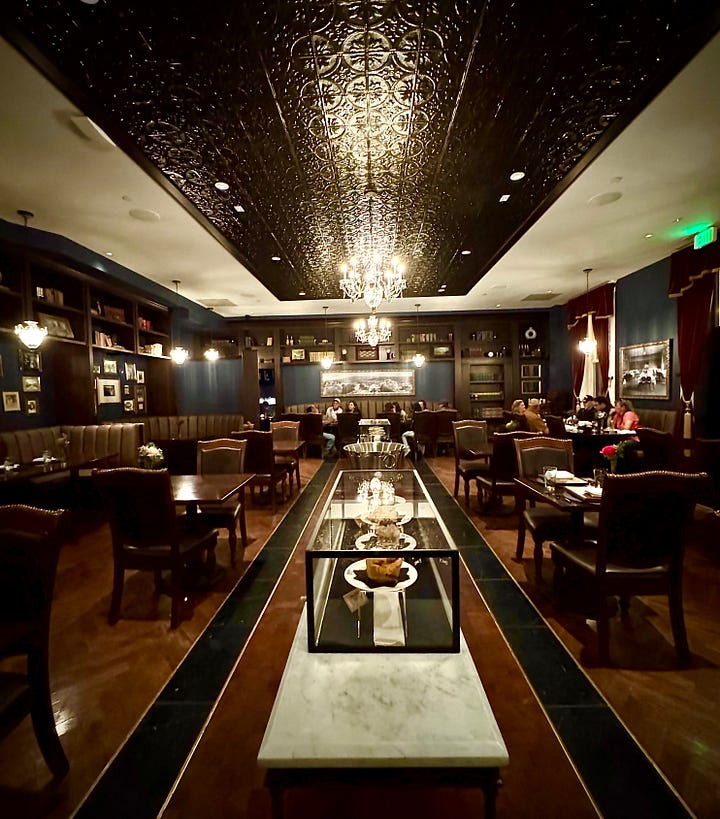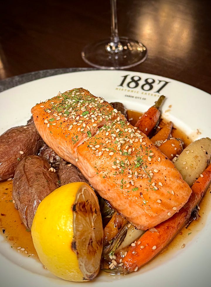 We bypass apps like crab cakes and pork belly bites plus soups and salads and go right to mains, where the real pricing kicks in. Salmon for $36 and lamb lollies for $44. The fish is advertised as glazed with a lemon-lavender-infused honey, drawing us in, but what arrives is a sickly sweet faux maple syrup (Log Cabin methinks) with high fructose corn syrup vibes start to finish. Like breakfast for dinner sweet. Speaking as a former beekeeper, I can say that no bees I’m aware of make a “honey” like this. Everything it touches is worse off for it: the fingerlings, carrots and dry (cooked past medium) fish. In my notes I callously scribble “a sentient being was murdered for this dish? Twice!”