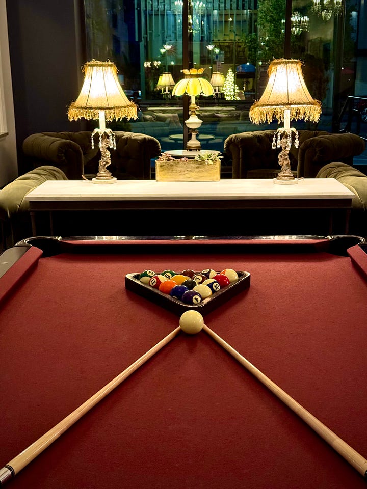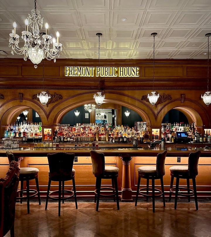 Hotel St. Cloud’s lobby feels chic and stylish, with a showpiece landscape photo of a bison over a fireplace (glowing because it’s actually a TV screen with a frame around it — I went snooping at the edges). There’s a cool four-way leather chair adjacent to a pool table, and the Fremont Public House acts as the lobby bar one storefront over. (You can take drinks up to your room if you wish.) The hotel also owns Fremont Provisions, a sports bar, a couple blocks away down Main Street. But we opt to eat on-property at their finer dining spot, named 1887.