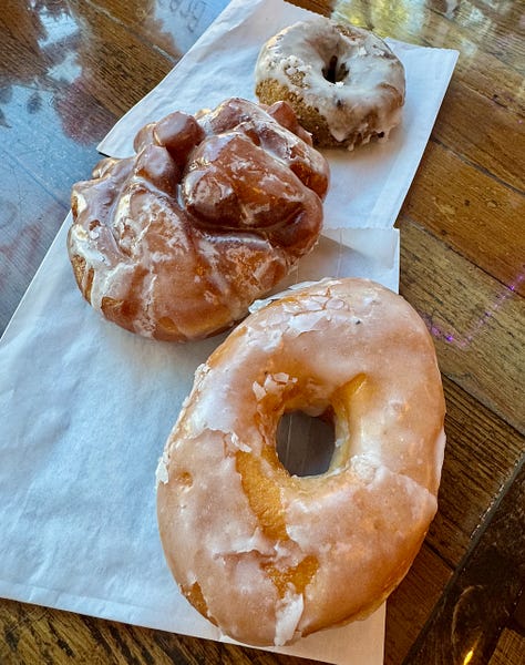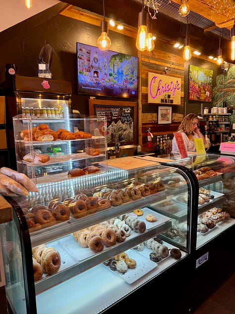 We try three. The raised, glazed yeast donut is a little on the dryer side, pairing well with coffee — which Christy’s also serves, including specialty lattes. A cinnamon roll cut to look somewhat like a pineapple, then fried and glazed like a donut, offers a nice contrast between crispy edges and chewy inside. The blueberry cake donut is a delight: soft and sweet and perfect with sips of coffee. I’m not normally a cake donut fan, but I’d make a return trip just for that.