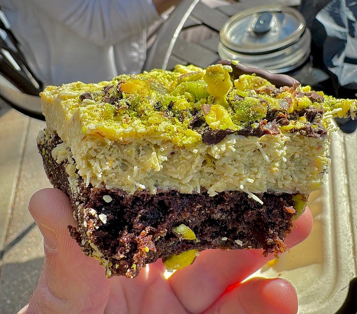 Also belonging to Hotel St. Cloud, Standard Oil Coffee Co. resides just across Seventh Street as a neighboring cafe for daytime coffee and sweets. They serve fine pastries made by the hotel, including a ridiculously good Dubai Chocolate Brownie that I felt compelled to try. The kataif crunch texture is totally on-point, layered thick under a pistachio crumble topping and thin hard chocolate vein, with a chewy chocolate bottom. I didn’t think I would like it as much as I did, and I failed with my intent to just take a bite and save the rest for later — I put the whole damn thing down, paired with sips of a lovely cortado.