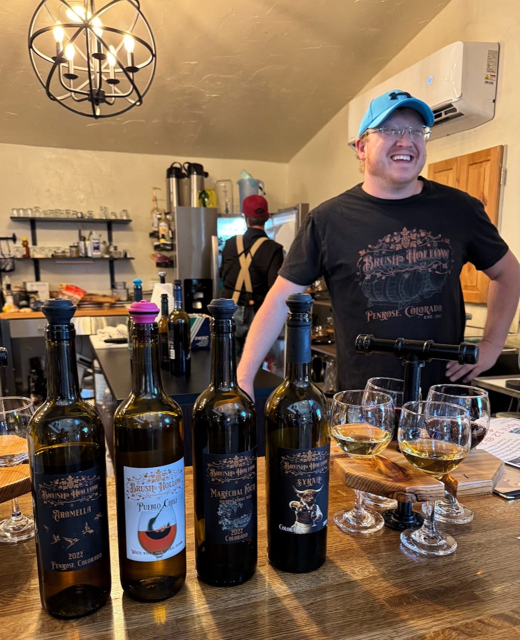 Brush Hollow opened six years ago in Penrose, stemming from a prior distilling operation in Laramie, Wyoming. (They also briefly popped up in Cascade, not far from Wines of Colorado as it were, but that test didn’t prove concept for a steady location.) They’re known for their Neapolitan wood oven pizzas (which we can’t try because of fire restrictions this day); a fat house cat that’s depicted on one of the labels; special Friday night pasta services; and wines made on site from Colorado-grown grapes (most from the Palisade area, but some local to town).