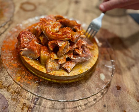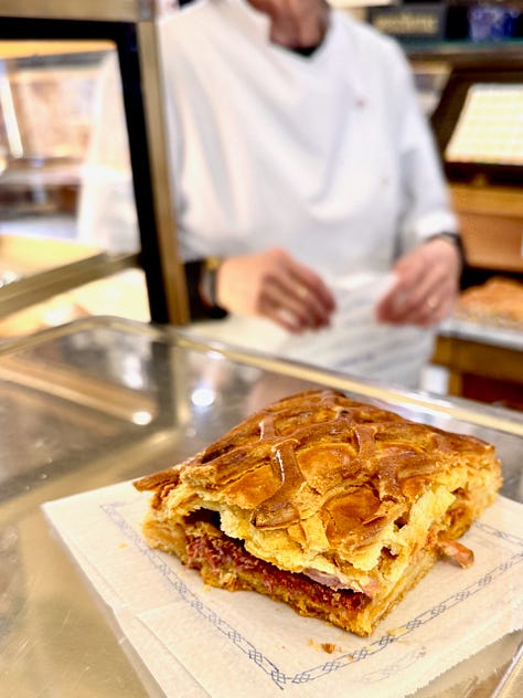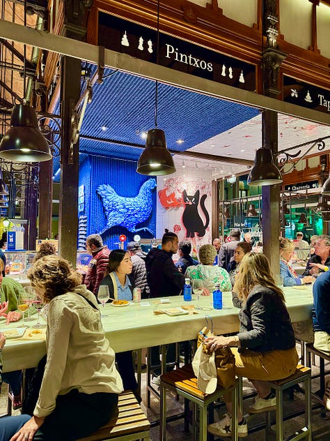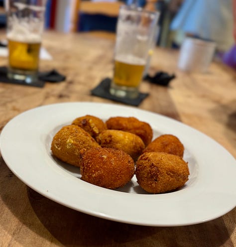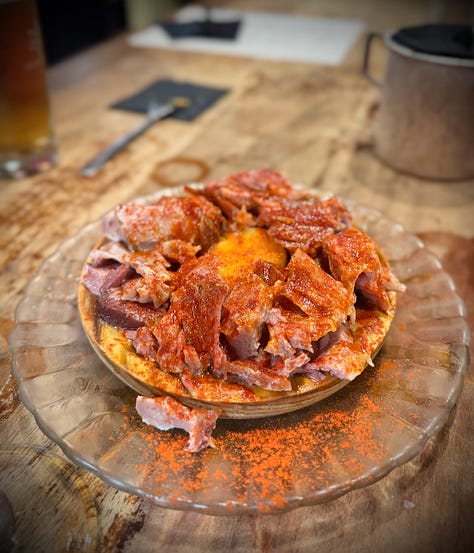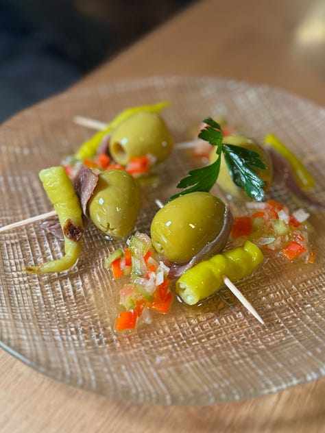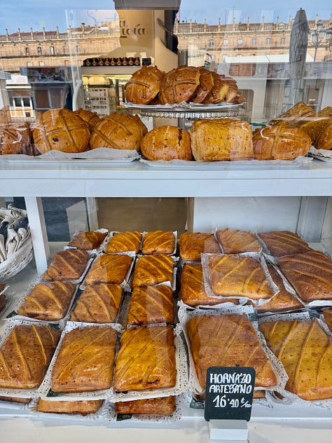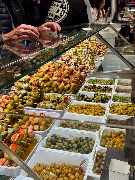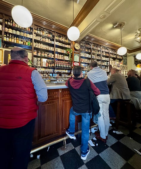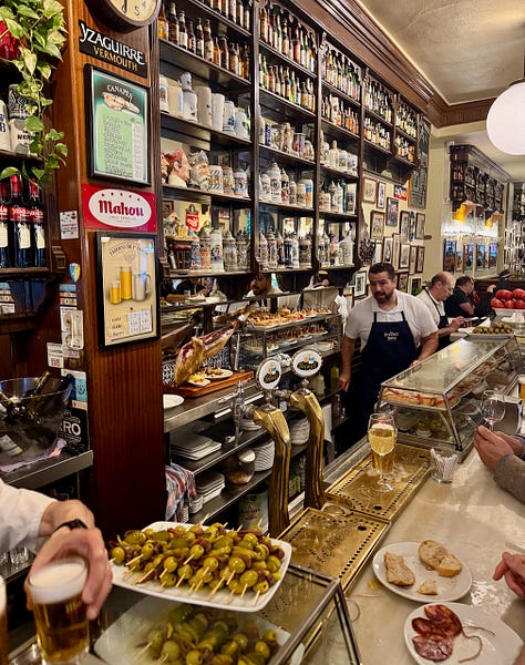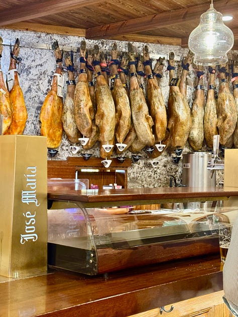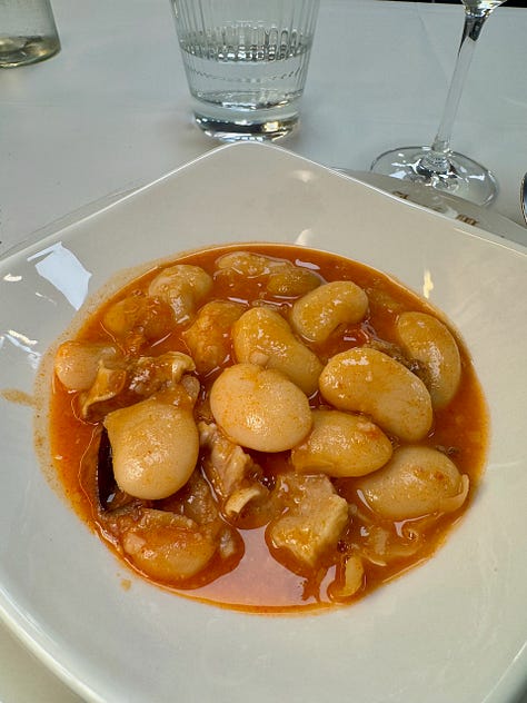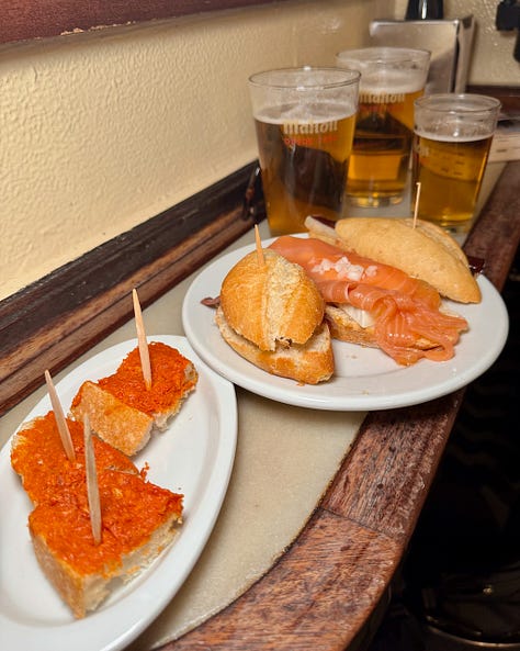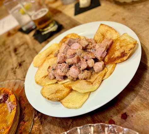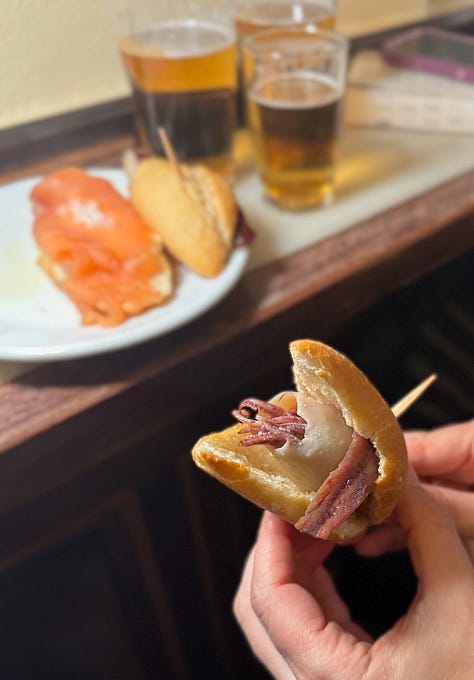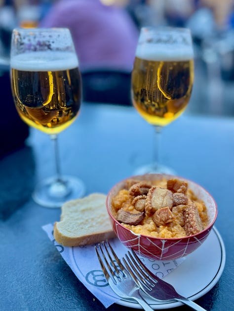 Located inside Salamanca’s Art Nouveau & Art Deco Museum is El Café de Lis, a colorful spot to grab some tea and coffee (or a boozy drink) thanks to the iconic stained glass windows that illuminate the space. Something to grab in the town that’s not found anywhere else is an awesome “meat pie” pastry called hornazo. (It supposedly has historic roots related to welcoming prostitutes back across the Tormes river after lent concluded.) Sandwiched in between wonderfully flaky and dense dough you’ll find lomo (marinated pork loin), chorizo and Spanish ham. Of all the pastries we had on the trip, I still think about this one. Another fine discovery was patatas meneás, which is mashed potatoes with paprika, bacon and chicharrón. Paired with beers: fabulous. Lastly, we sat at the bar at Michelin-awarded Taberna de Libreros (sans reservations) and dined on pinchos and sipped wine. Patatas con salsa brava de chipotle were like crispy home fries with a smoky, lightly plum-y, tart sauce. Gildas are a skewer of oily and punchy anchovies, green olives and pickled Guindilla peppers. And Champignones al Jerez are mushrooms in an herb and sherry broth, all combining for lovely umami and earthiness.
