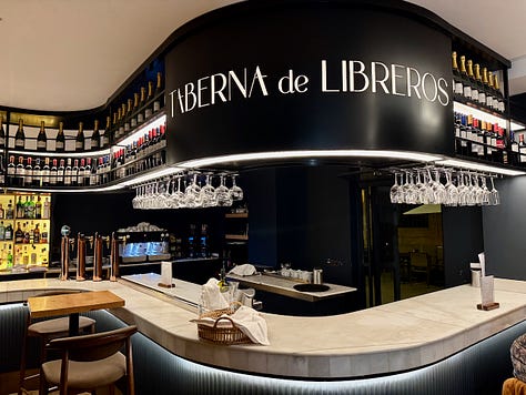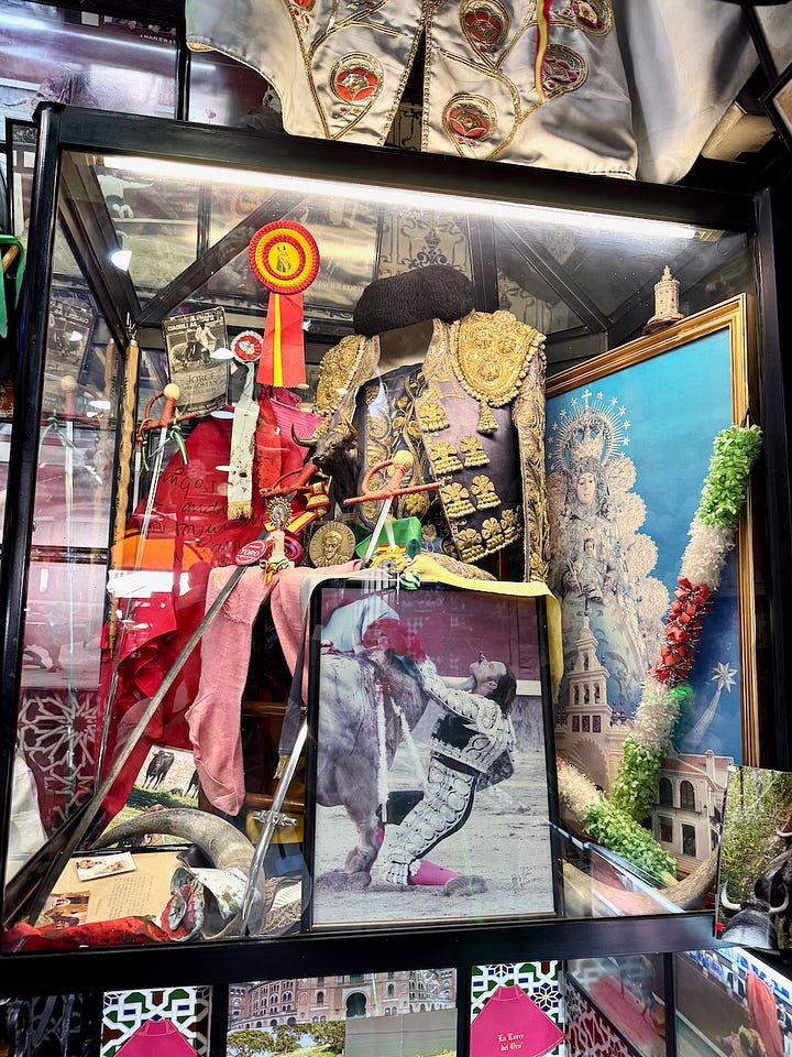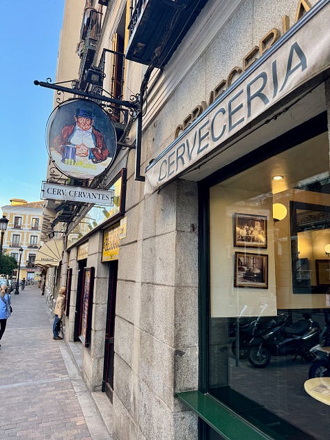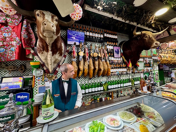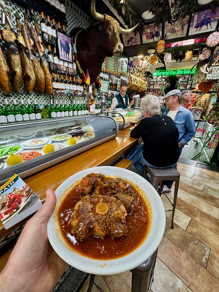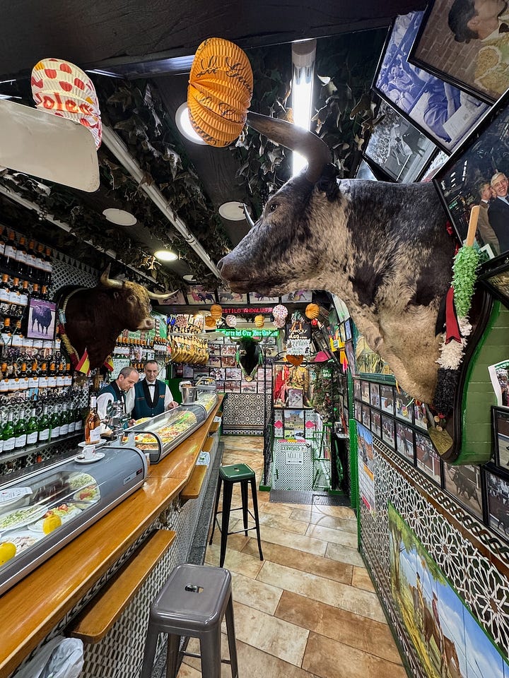 Though we’ll stop through Pamplona later in the trip, La Torre del Oro on Madrid’s Plaza Mayor is where you really come face-to-face with the bulls. Dedicated to bullfighting, and housing imposing taxidermy, it’s a mini museum complete with wall-to-wall historical photographs and memorabilia. Everyone from international presidents to dictators are pictured at the famous fights. We grab beers and an oxtail stew — totally on brand, obviously — and also put down some free gazpacho and paella samples given to us as complimentary dishes.