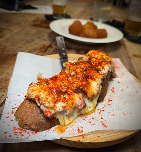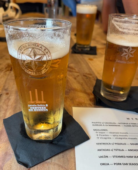 We miss out on finding percebes (barnacles) as desired, but Lauren’s friends who live in the area do take us to a wonderful bar they frequent and buy us a fantastic spread of food. The pulpo y patatas photo at the top of this page was snapped during this meal, and that dish was one of the single most memorable of the whole trip. The octopus was the probably the softest and most tender I’ve ever had, seared and seasoned with olive oil and paprika. Those two ingredients informed several more dishes during the meal, including pork shoulder, pig ear (full of collagen and chewy) and octopus and cheese on toast, which proved less weird that it sounds and actually quite rich and good. Spanish croquetas (croquettes) were a fun starter with the local Estrella Galicia beer. And we were stunned by another dish named raxo, a Galician pork plate presented with thick-cut potato chips. The meat’s bursting with garlic flavor, and with a salty chip bite and beer sip the whole eating experience is comfort food bliss.