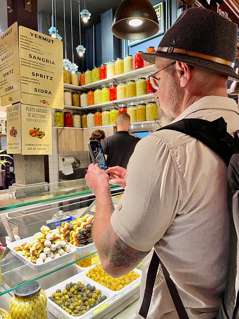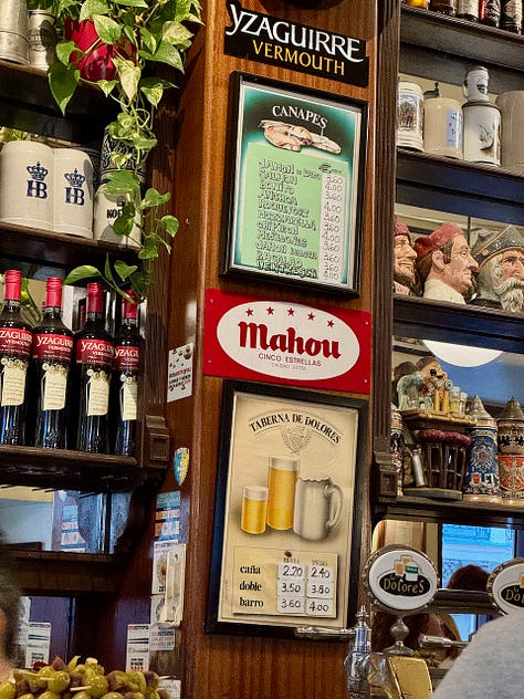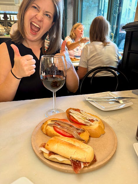 On another evening, we meet up with our friend Candace from the Springs, who’s coincidentally traveling at the same time. We create our own tapas crawl over beers and wines, ducking into a few sequential spots on a street named Plaza de Jesús near the giant El Retiro city park (thanks to legendary travel guide writer Rick Steves for pointing us there). Among the tapas and pinchos (small bites): various anchovies and tomato slices on toast (tostada de anchos); Iberico ham, smoked salmon and spicy tuna on soft rolls; chiporones (squid) wrapped in anchovies; and smoked tuna on baguette.