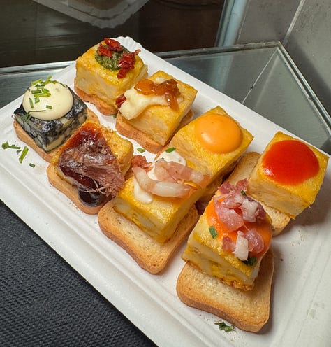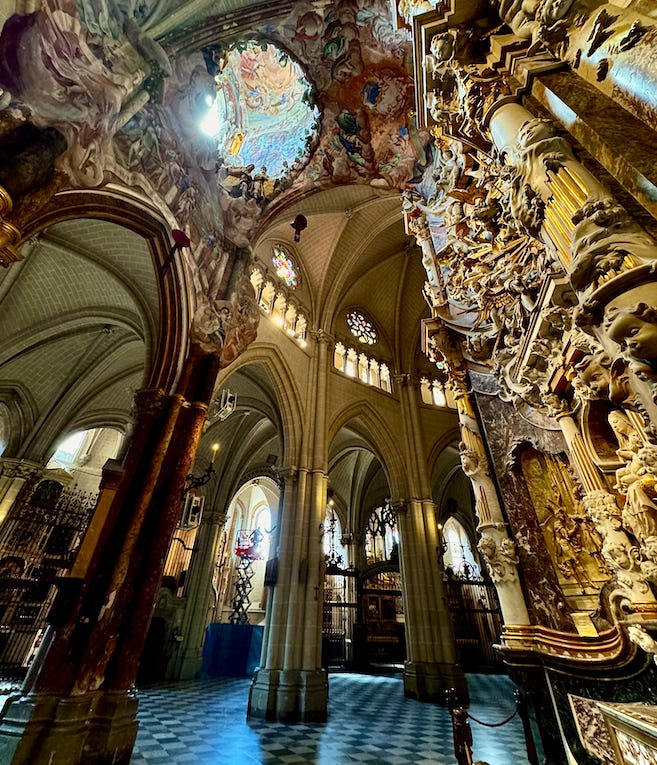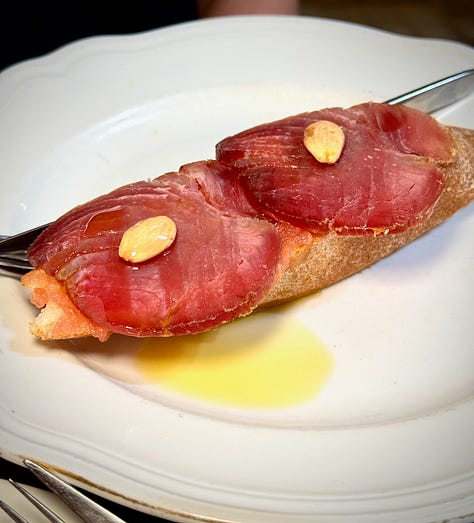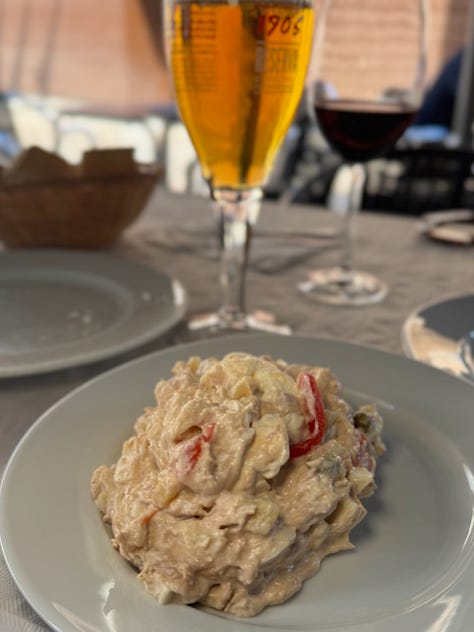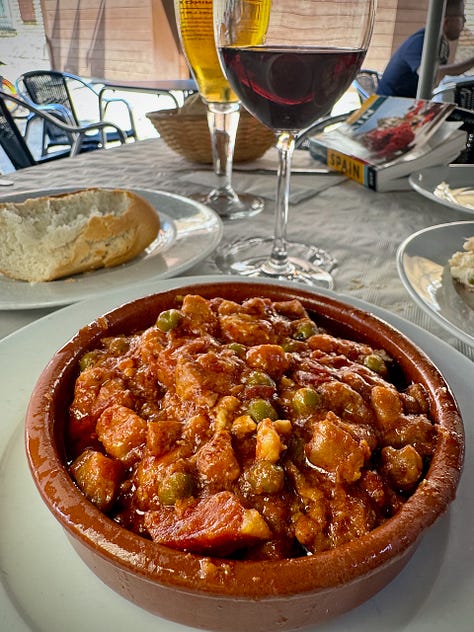 If you head for a daytrip to Toledo from Madrid to see its stunning cathedral (perhaps the most impressive I’ve seen in all of Europe to date), plan to swing by the notable Santo Tomé Bakery for one of the pastries made with marzipan. Our lunch consisted of two hearty and satisfying items: a Russian salad with potato and tuna and the localized carcamusas pork stew in an oily, lightly spicy tomato sauce with a touch of sour acidity. With red wine, a light beer and a baguette hunk for dipping, this meal delivered everything we didn’t know we needed at that moment of rest between sights.