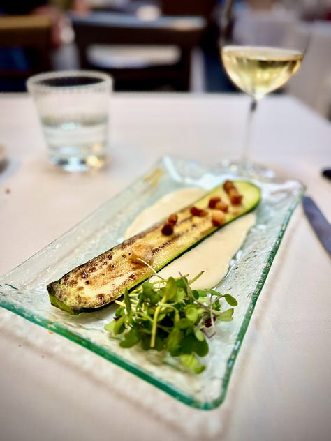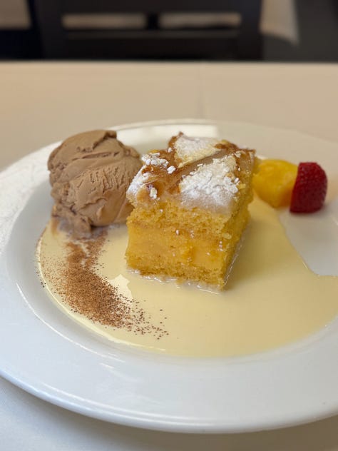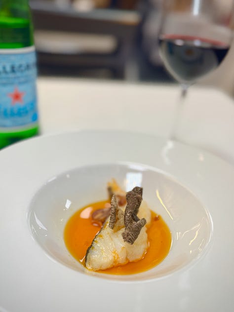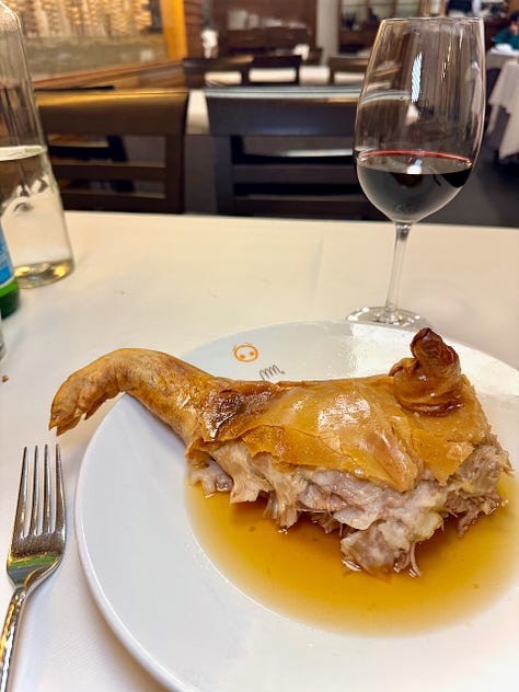 The focus of our stop in this beautiful city, known for its nearly 2,000 year old, impressively preserved Roman aqueduct that runs through town, is the Michelin-recommended restaurant José María. Its specialty: roast suckling pig, part of the area’s cultural and culinary heritage (as the menu informs you). We go for the seven-course tasting menu (a relatively affordable $70 euro per person). It starts light with small bites of leeks and roasted bell peppers plus grilled zucchini in a cheese sauce with bacon crisps (a whiff of what’s to come). Then ham and bean stew with locally grown Judiones (large white beans), and an unctuous cod loin cut infused with bacon essence and garlic. Finally, the main attraction: Cochinillo de Segovia, suckling pig so obscene texturally that you’ll be ruined for pork for life. Its thick skin cracks like peanut brittle, audible to the tap of a fork, and the word “juicy” fails to fully describe the absolutely tender meat underneath. (New upscale dining categorization: swine dining. I pun!) Dessert was outstanding in its own way, with a Ponche de Segovia traditional layer cake with crème anglaise and nougat ice cream.