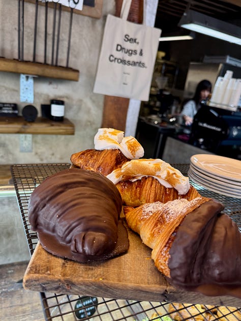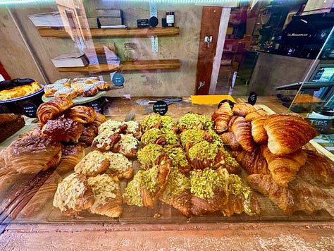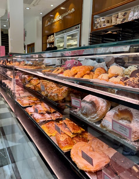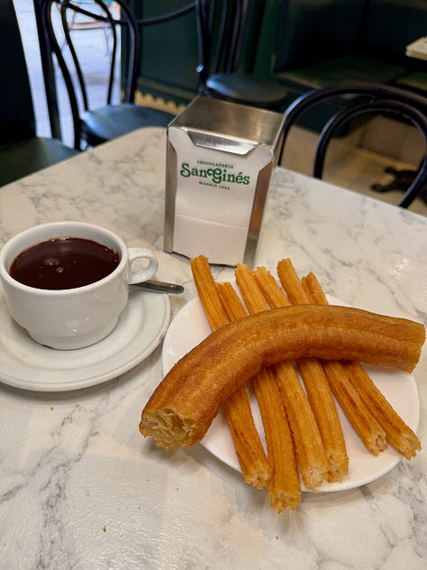 Of course we ducked into many pandaderias, pastelerias and reposterias (bakeries, cake and confectionary shops respectively) in Madrid and elsewhere during the trip. Something we indulged in more than once was the churros and chocolate phenomena, widely available but particularly famous at 120-year-old Chocolatería San Ginés. To dip into a thick, pudding-y drinking chocolate, you can get the familiar mini churros or larger porros, which are totally phallic (and only a small step away really from the penis pastries in Amarante, Portugal that we ate last year). Moving on, Lauren has a daily goal in Europe to always enjoy one croissant, and we peaked early in the trip by discovering a place called Pum Pum Bakery, motto “Sex, Drugs & Croissants.” Their pistachio croissant rellenos (filled with a sweet pistachio cream and topped in the crumbled nuts) are epic, and unforgettable.