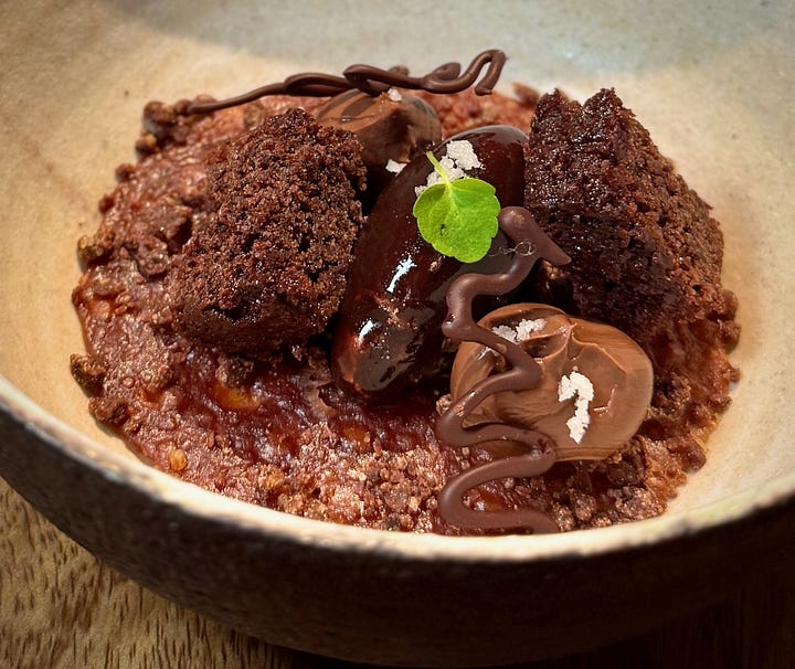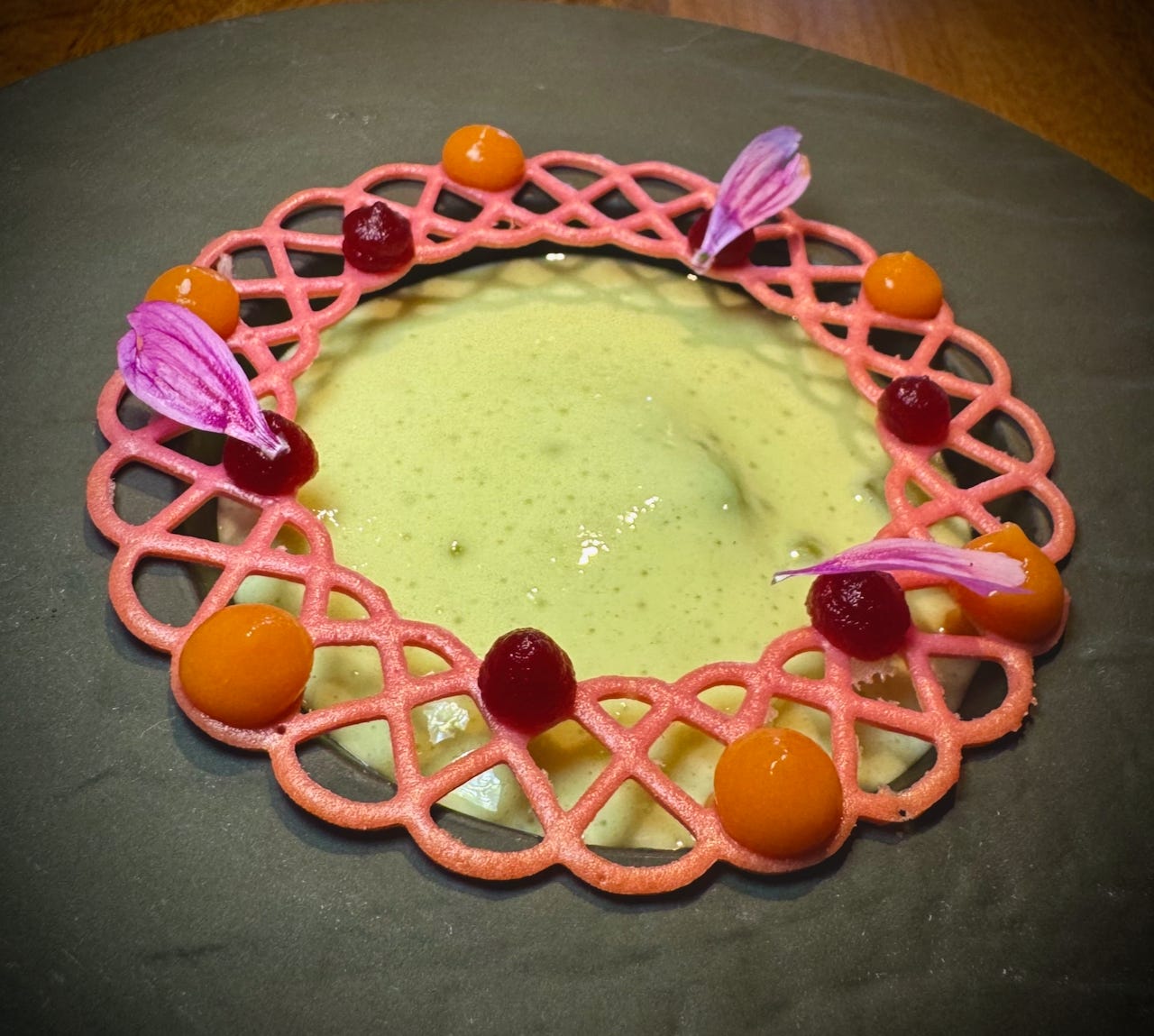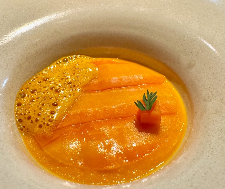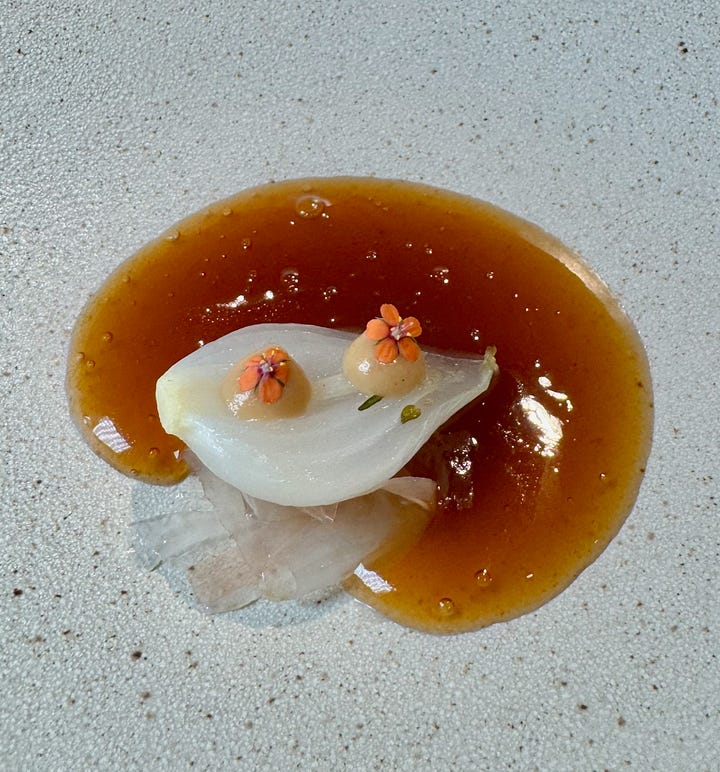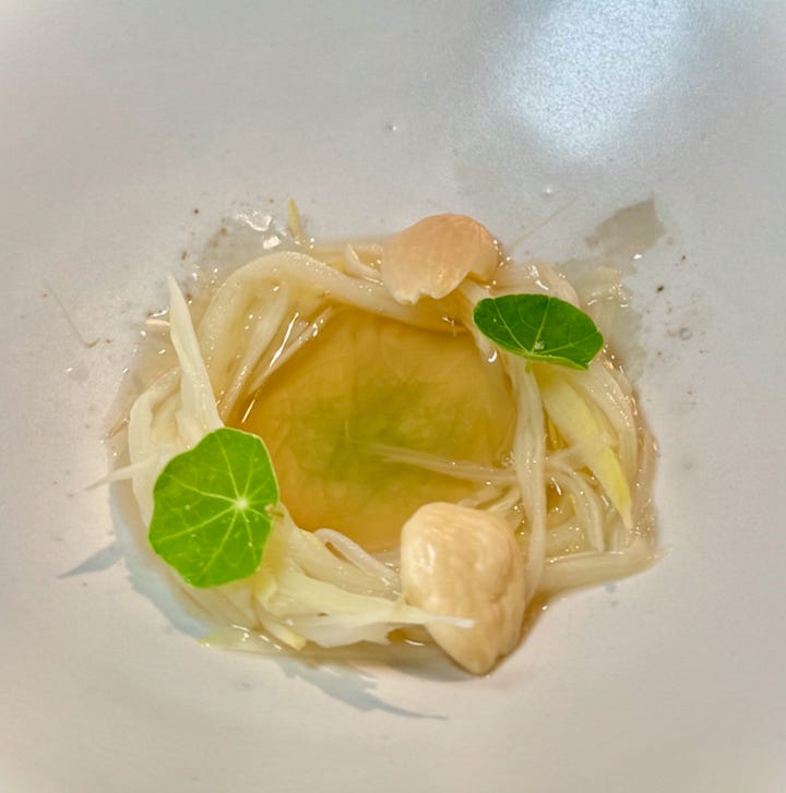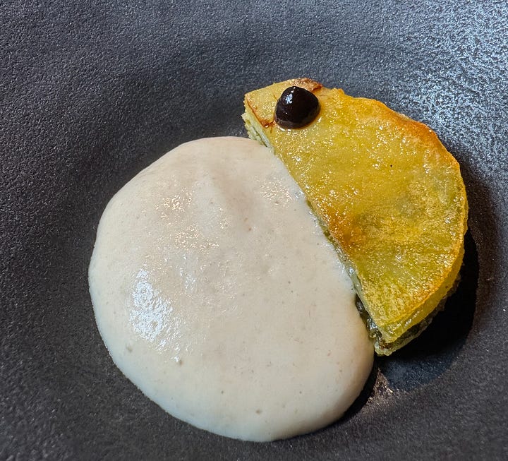 We’re served our amuse bouche course from the dozen-ish-course tasting menu (depending on how you count them), which is reasonable (for a Michelin) $95 euro at lunch with a $75 euro wine paring. (I had to drive and am increasingly a lightweight, so we shared a single pairing.) There’s an egg yolk infused with chicken broth (meaning they cross the road into your mouth at the same time — dad joke!); an Indian yogurt and beet purée presented in a crispy papadum-like cup; and a triangular daikon purse filled with a miso-celeriac mix.