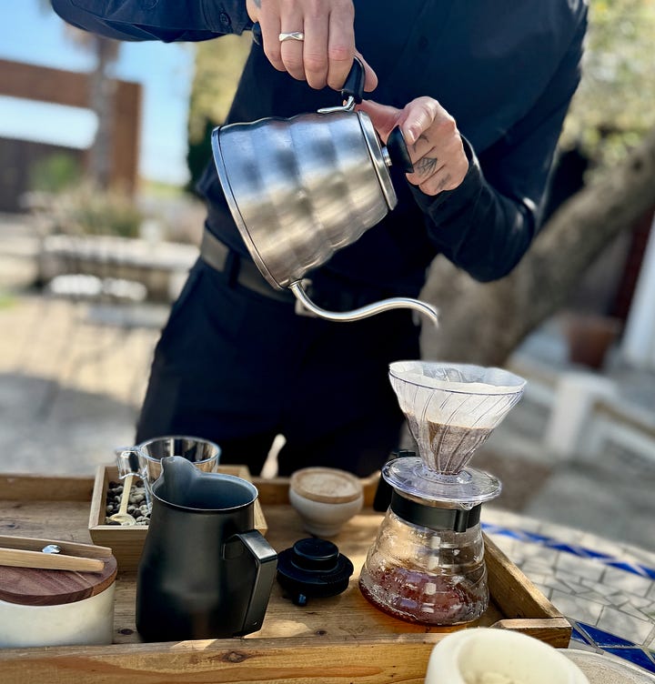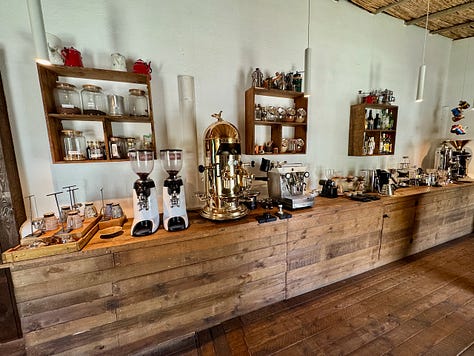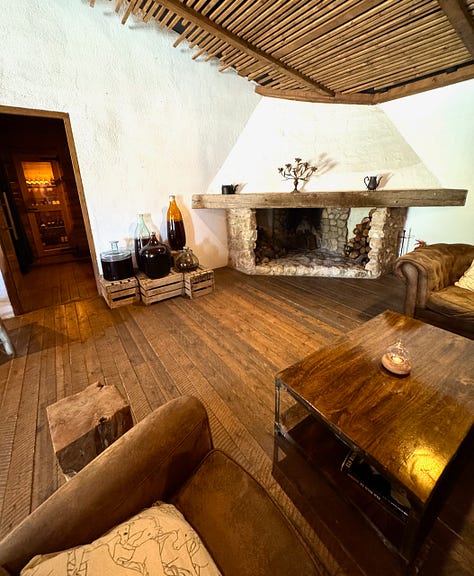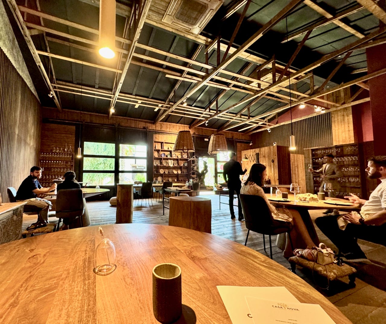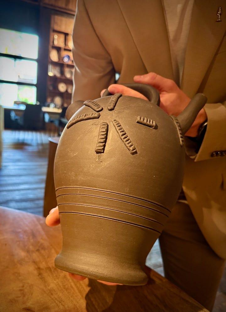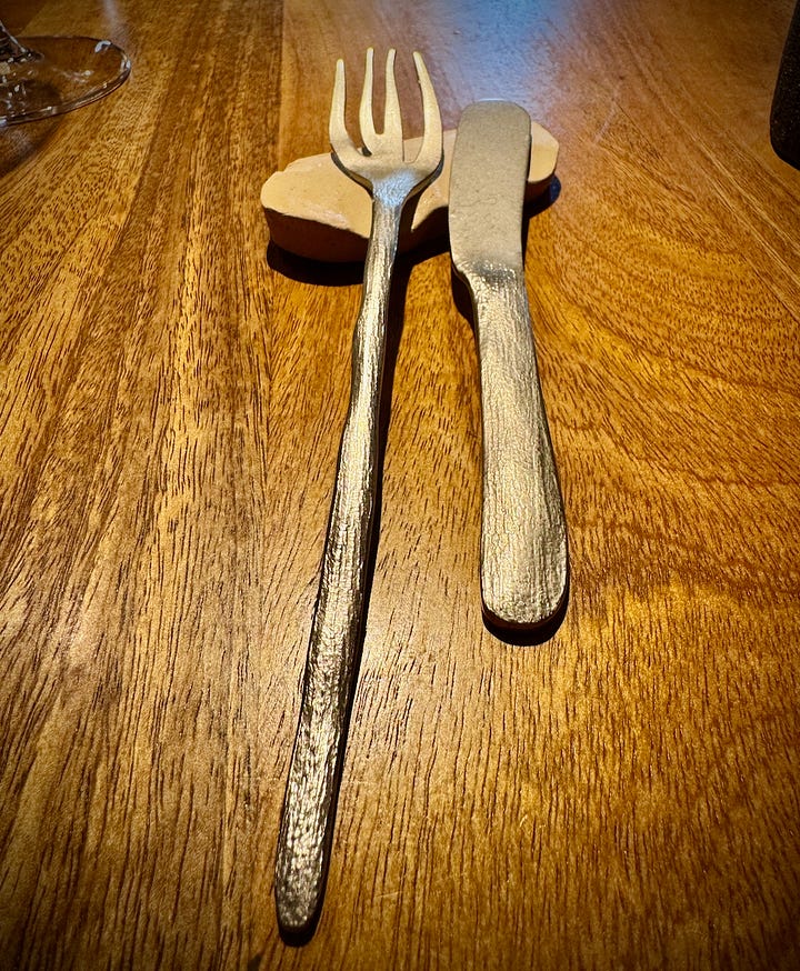 Tomás tells us “we focus on quality over quantity,” by way of explaining how they only seat eight diners at a time at lunch. This day, the culinary team outnumbers us. We know this, because they walk us through the kitchen to arrive in the expansive, wood-dominant dining room, rustic and simply appointed. Water is poured from large clay, house-made jugs. Glass- and stemware are elegant. The cutlery is stylish as hell.