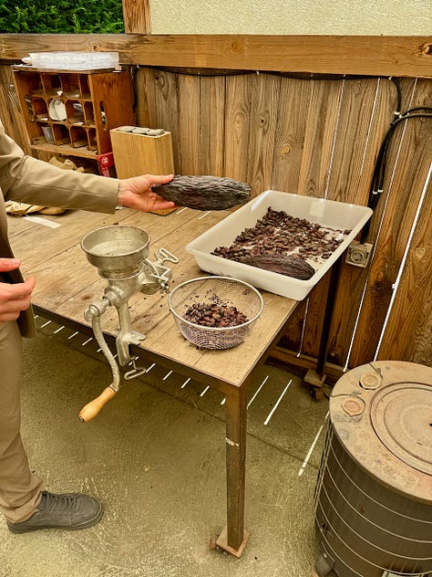 Our late afternoon visit to Casa Nova began with a tour of the herb and veggie garden, scented by lavender and rosemary plants. Neighboring vineyards glow in the sunlight. Before Torres bought the land a couple decades ago, it hosted a chicken farm. We’re given explanations of various ingredients and techniques and are told they press their own olive oil. Coffee beans from Columbia and Indonesia and cacao beans from Guatemala are roasted on site. Bread is baked in a wood-fired oven like those used by Quechua-speaking communities in Peru, except the wood is actually vines pruned from nearby wine-producing vineyards.