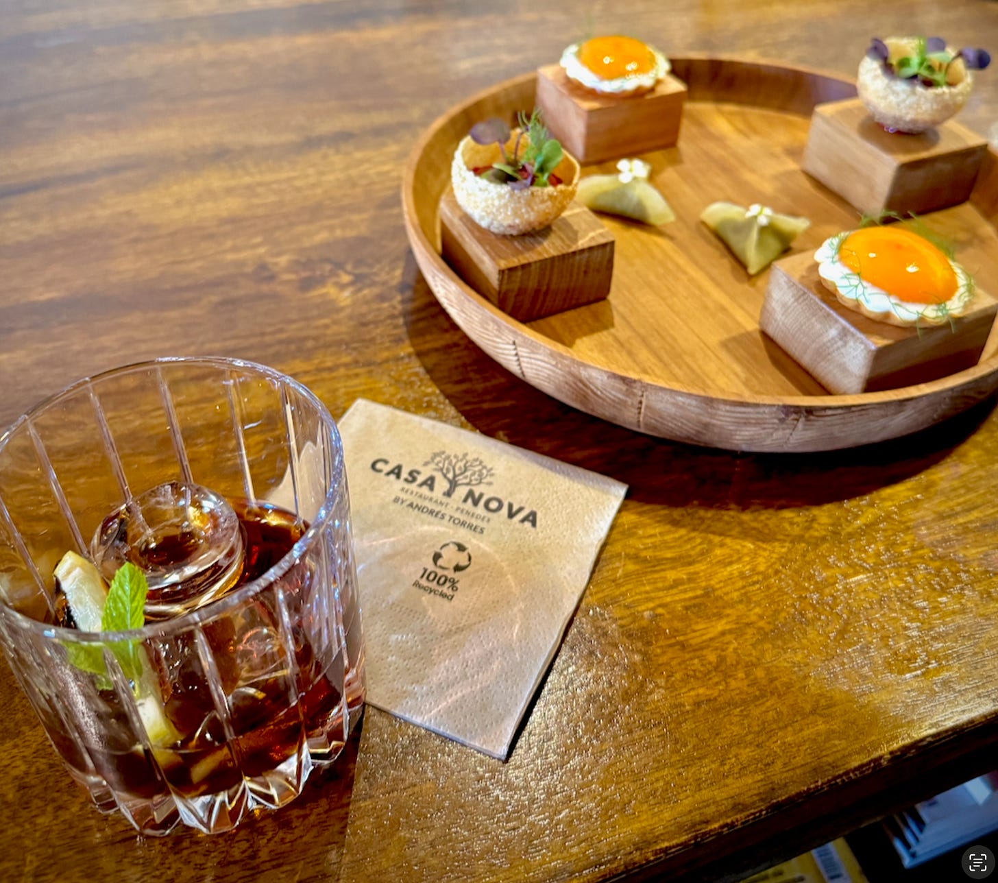 Matthew picking up the story from here: Following the tour we enter the restaurant and walk down a long hallway past a display of vintage and modern coffee equipment. We’re seated in a lounge across from a fireplace and liquor display hosting rums collected by the chef. Our server and sommelier Tomás pours us a glass of Spanish vermouth garnished with a lemon slice and mint, and gives us a quick education on the local viticulture production. He says they mostly grow white wine grapes nearby, which include Parellada, Macabeo and Xarello varietals used for making Cava. Also Spain’s Penedès wine region is known for the revival of ancient winemaking methods, like the use of ceramic aging vessels, which breathe differently than wood.
