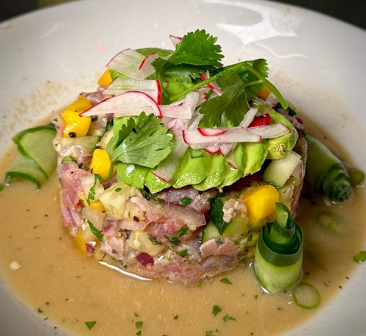 Anyway, our food and drinks were roundly fantastic. We started with a pineapple mezcalita paired with a plate of Ceviche del Pacifico (tuna and shrimp in a Leche de Tigre sauce with avocado and tropical pico). Next came a mushroom and white wine creamy Risotto del Pacifico made with ancho chile shrimp fumet (stock) and served with head-on shrimp and roasted vegetables. Plus a carne asada steak sandwich on grilled house sourdough, with caramelized mushrooms, avocado, Dijon and a side of au jus for dipping. We drank the Cumbia de Agave cocktail with it, composed of reposado, cucumber juice and pineapple syrup with mint and tortilla salt garnishes.