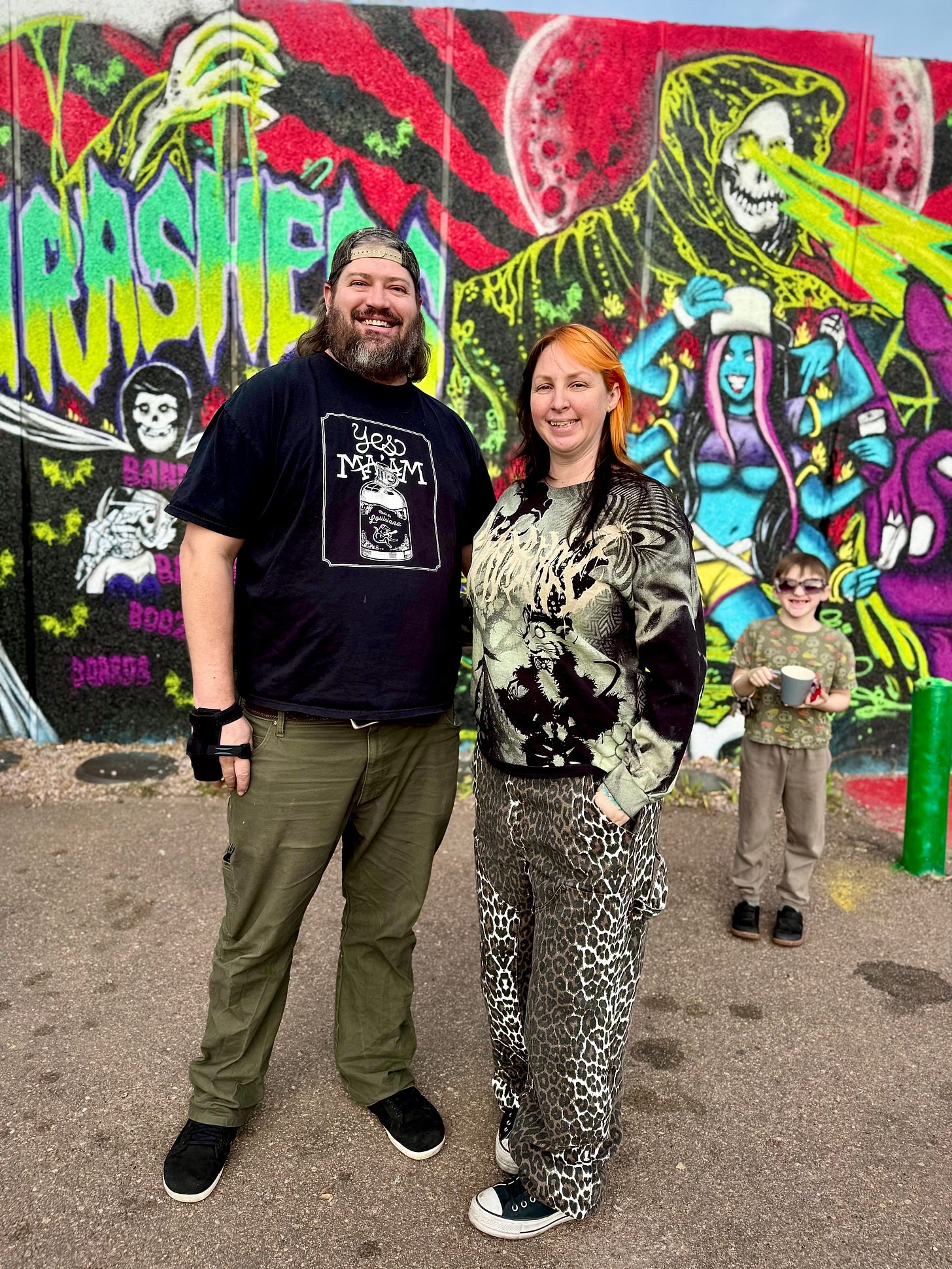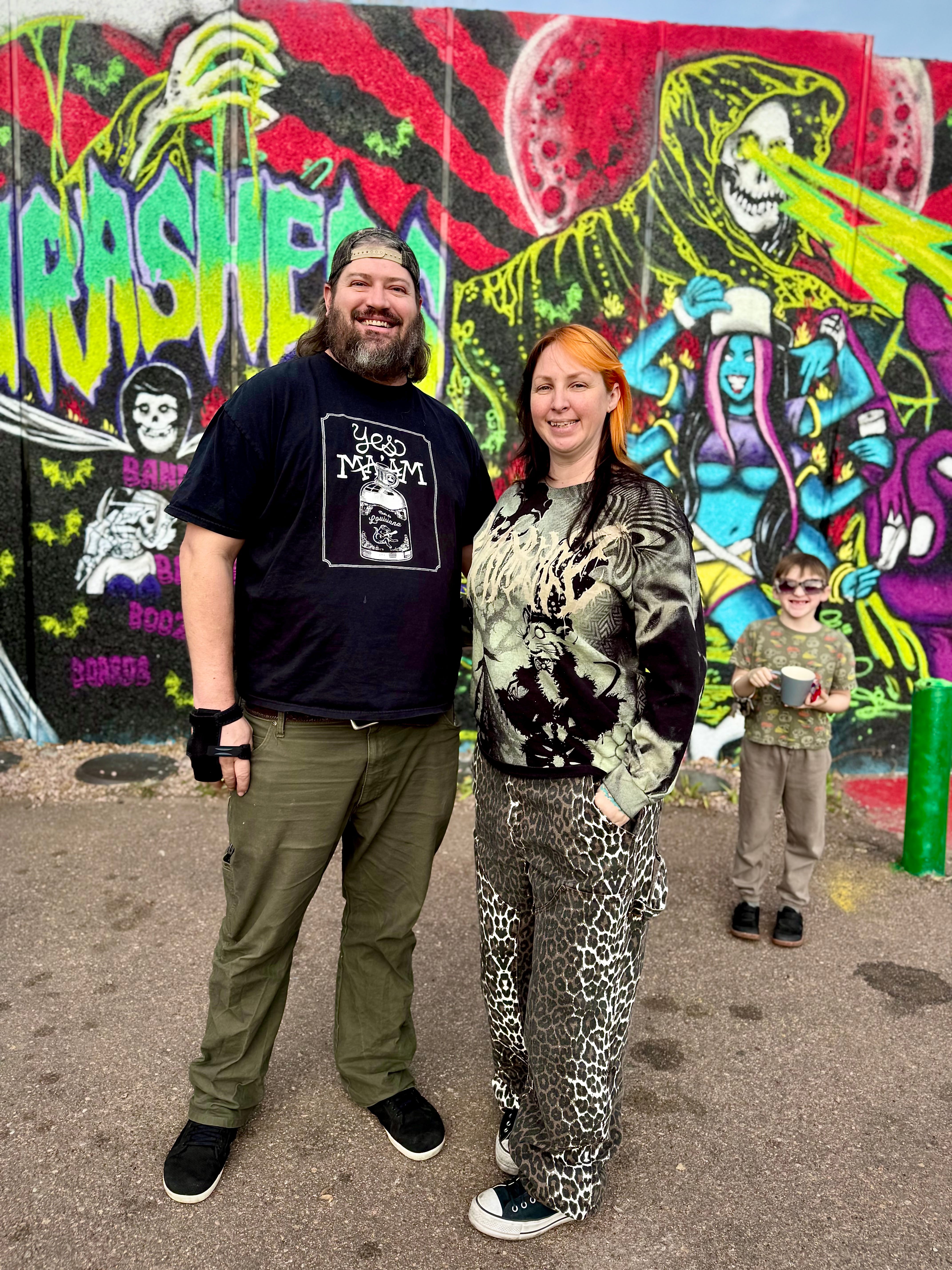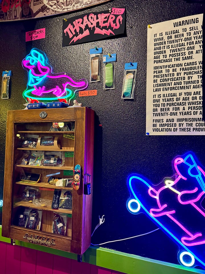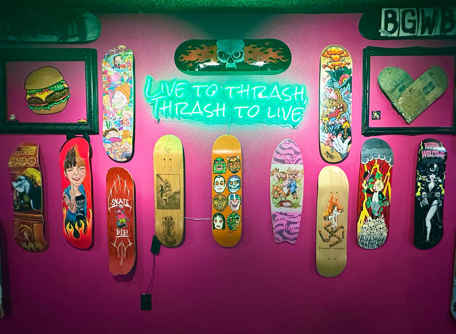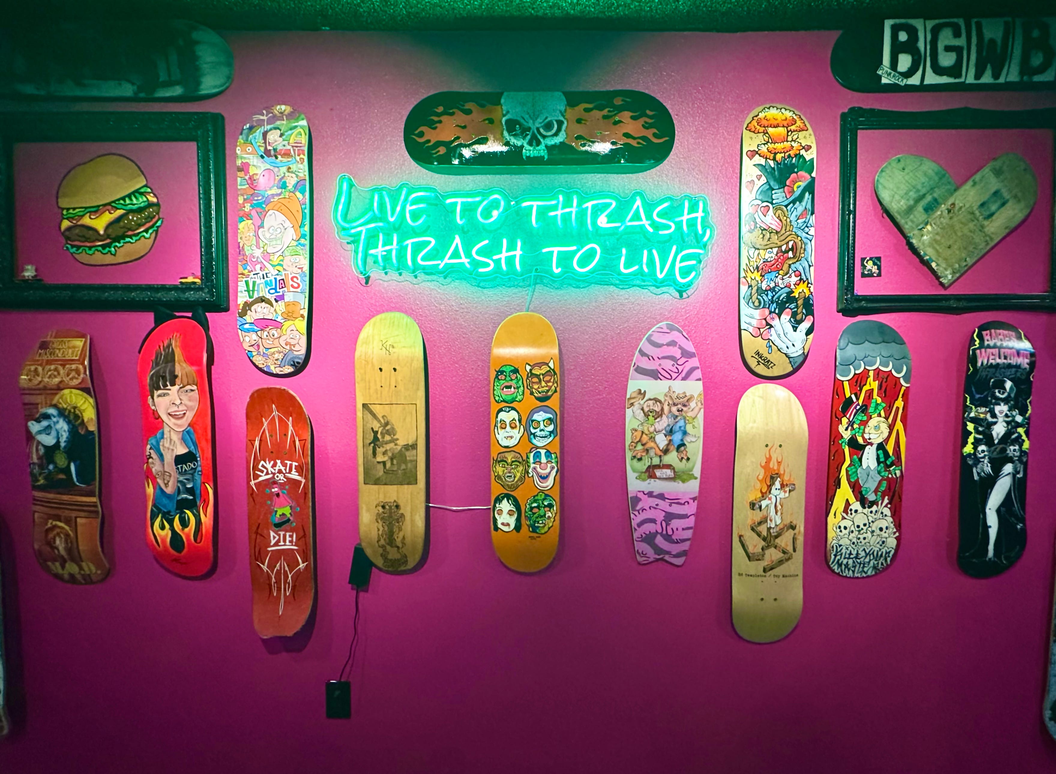 I returned to Thrasher’s last week to sit down with Connor and chat over a drink, and he further describes his and his wife’s breakdown of responsibilities as “she’s the business side and I do the music and social media.” He says they were both ready to work for themselves and be their own bosses, calling himself “too headstrong to work with others.” He also elaborated on some of what I’d read in an earlier interview the Gazette, about them both growing up skateboarding and listening to music. That informs the name and design scheme, complete with artfully designed custom boards hung on walls around the whole space. (Here’s a quick scavenger hunt for you: find the Tejon Street Corner Thieves deck as well as The Black Sheep and What’s Left Records boards as you tour around.)