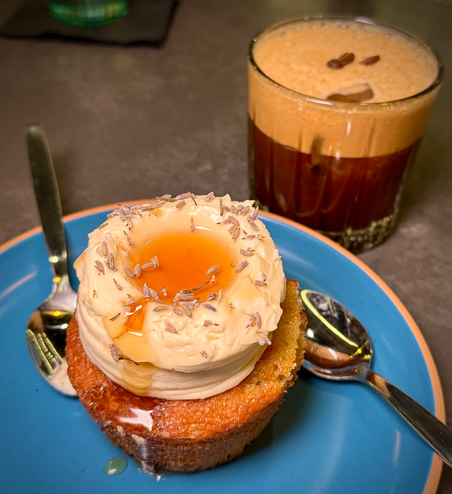 For dessert: a lavender honey cream cheese corn flour muffin paired with a Carajillo. The muffin is nicely under-sweet and they aren’t shy on the cream cheese frosting portioning, which itself is also less sweet than expected. Lavender flower petals add both beauty and floral impact, heightening the honey’s wild flavor. All the baked goods we’ve so far tried from Totem have been great, but this one’s exceptional.