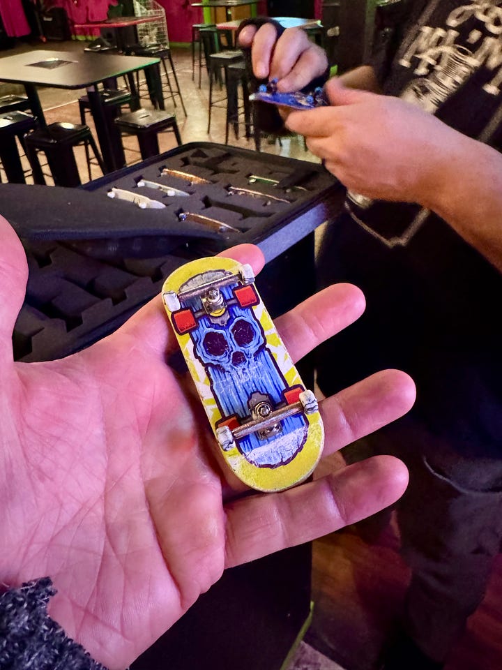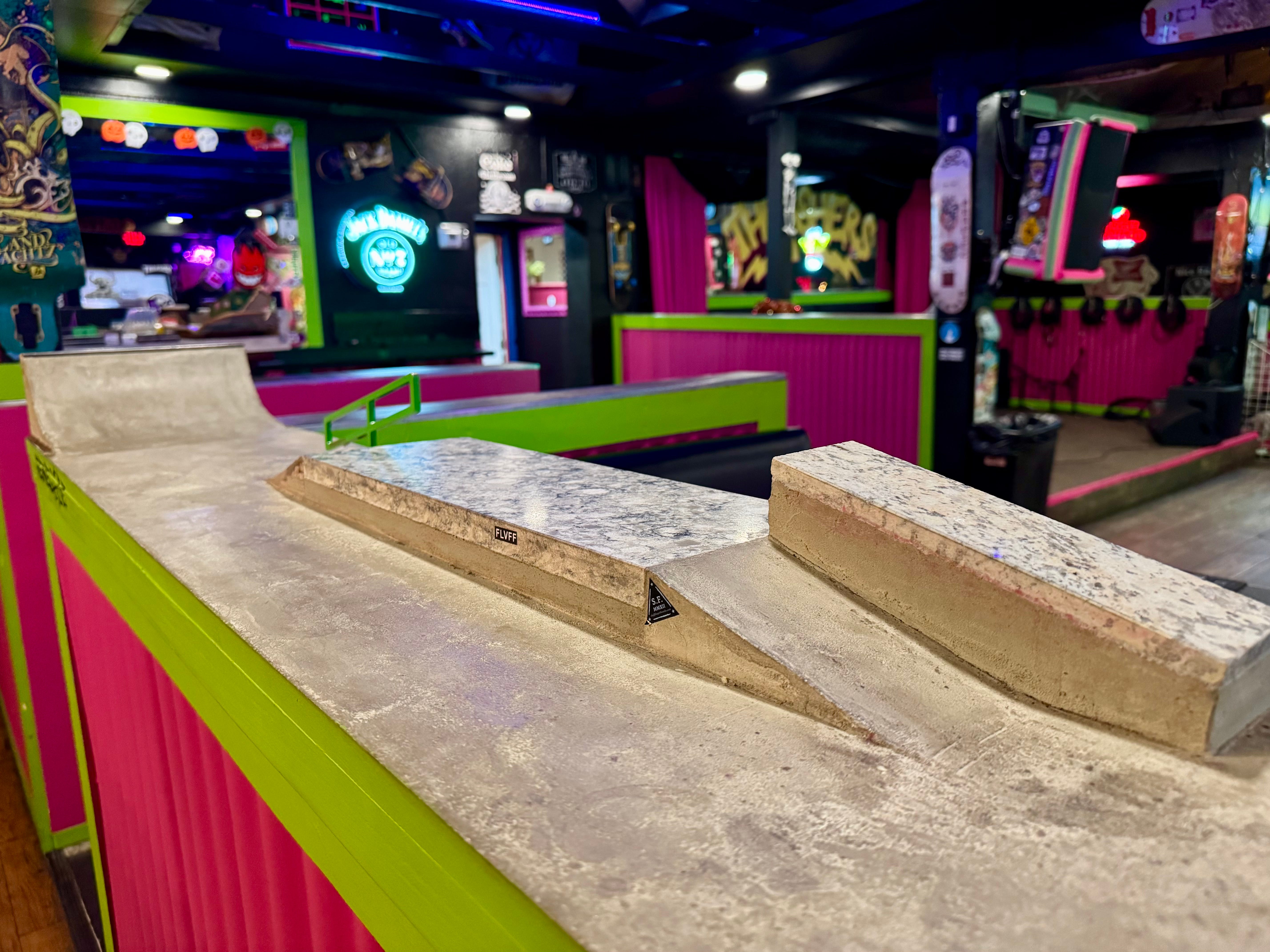 In a first for Colorado Springs, they’ve also installed a huge (read: lengthy) fingerboard skatepark on the rail of a half wall above a bank of booth seating. I didn’t know what those were until being introduced to them here. They’re literally miniature skateparks complete with platforms, rails, ramps and bookend half pipes, on which riders use their fingers to ride mini skateboards. Thrasher’s sells Tech Deck boards near the bar (click that link to get a good visual of someone doing tricks). Connor makes me feel a little better about being out of touch by telling me that a lot of people didn’t know what fingerboarding was until seeing it here. (Phew. Greetings my fellow uncool bretheren.) He found a local builder on Reddit to construct the outsized park and they’ve hosted one skate competition since opening. There’s a smaller park near the rear bathrooms and another small park currently under construction with a tentative January installation date.