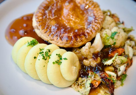 Lastly, he presents his Steak & Ale Pie, made by braising beef shoulder in Smithwicks red ale for five hours. Its reserved liquid becomes a beef gravy on the plate while the shoulder goes into a mini pie with a puff pastry top and shortcrust pastry bottom. Yukon gold mashed potatoes get piped into a swirl on the side next to seasonal vegetables drizzled with a “bistro gravy” made with veal demi-glace. It’s a hearty dish, perfect for the cooling weather now.