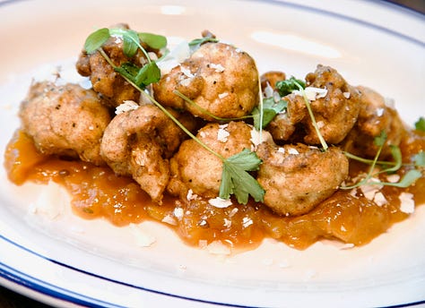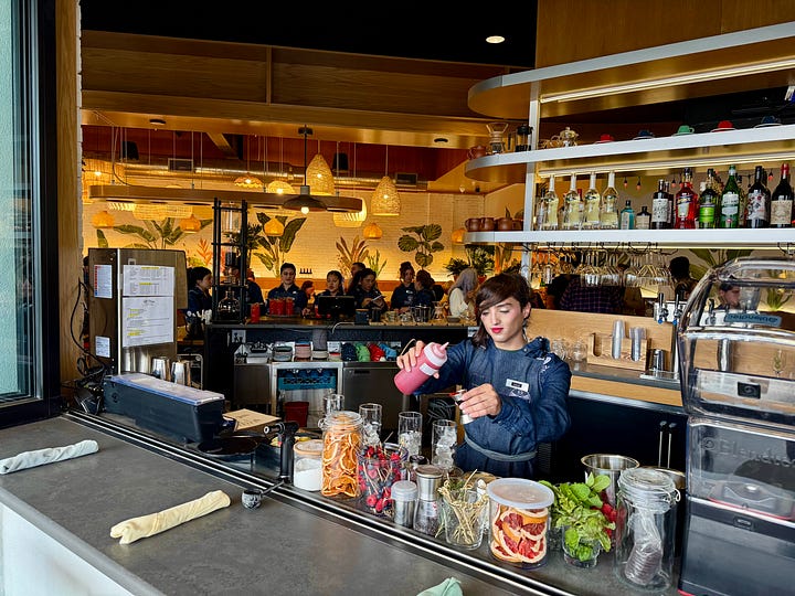 At a friends and family practice service earlier this week, I chat more with Griffin about these special Sunday roasts, which I learn are a very British thing. Families gather weekly at home and restaurants there offer special services as well. Griffin says he plans to cook prime rib, leg of lamb, half chickens and an English-style porchetta — pork belly stuffed with apricots and sage. “We want Sundays to be a big day for us,” he says, also touting a portable rotisserie that he plans to utilize regularly on the front patio, particularly for game days. He aims to cook whole pigs, lambs and chickens, likely to offer midweek specials.