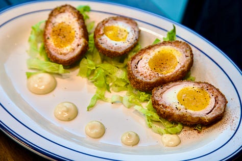 As a preview for me, Griffin plates a few flagship dishes. His Scotch Eggs are a “staple of motorway service stations and pubs” though his are “more of a gastropub take,” crusted in a ground pork and panko layer that’s crispy, but served with a soft-boiled vs. hard-boiled egg. “That makes them more creamy,” as does dips in Coleman’s English mustard aioli.