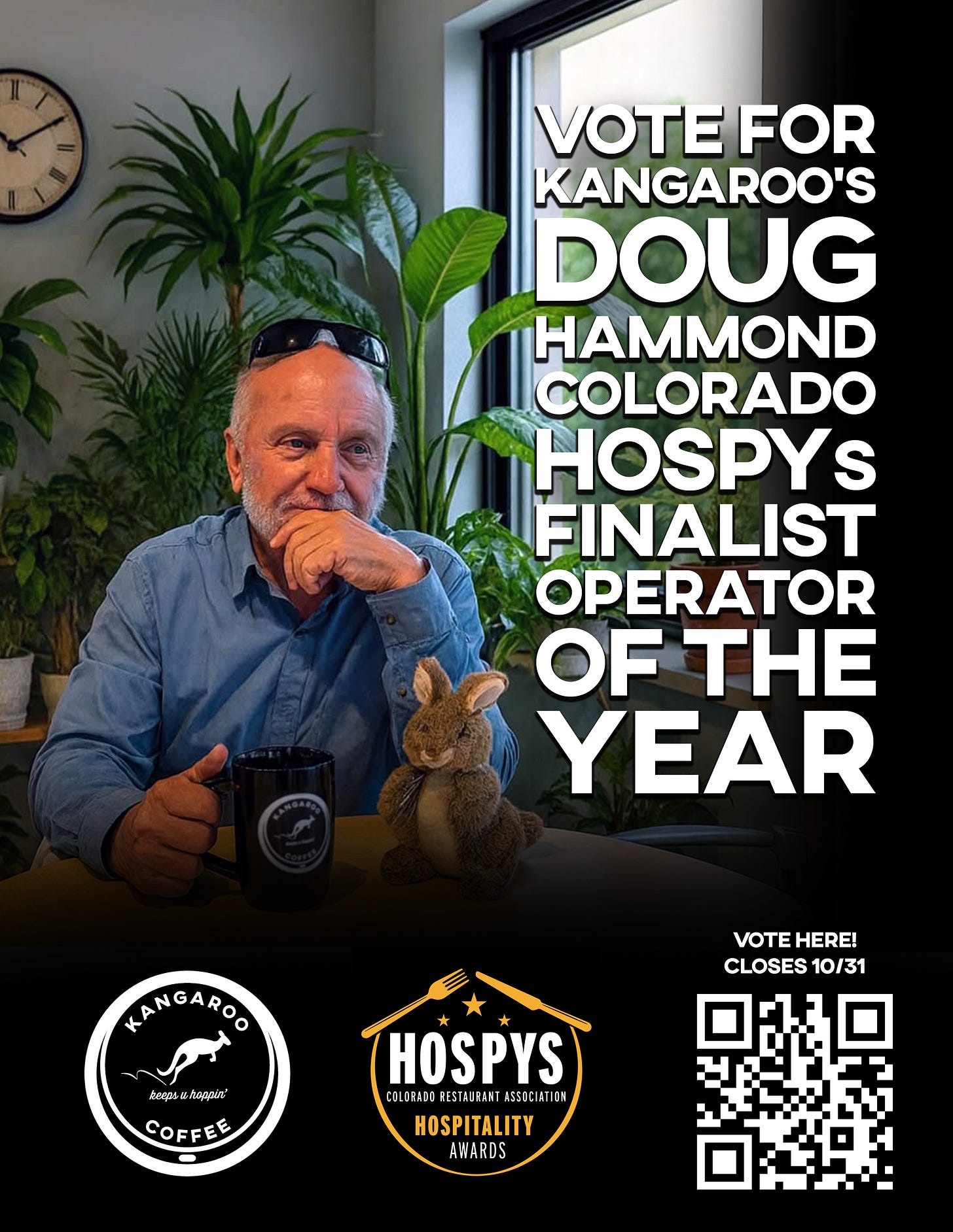 • Reminder: Vote by Oct. 31 in this year’s Colorado Restaurant Association HOSPYS Hospitality Awards. Side Dish Dozen member Doug Hammond of Kangaroo Coffee is nominated in the Operator of the Year category.