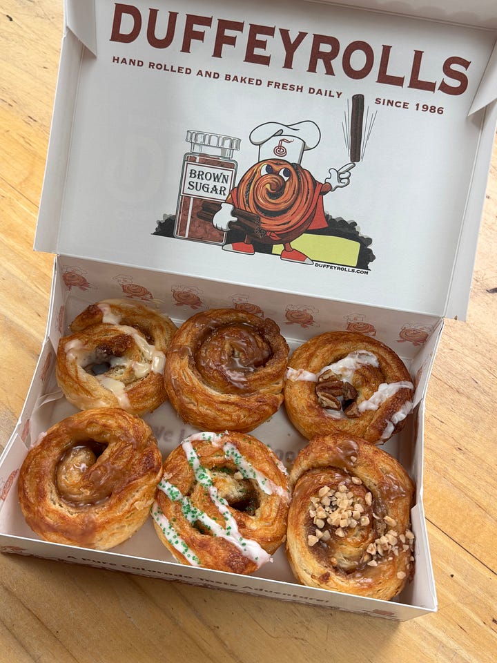 The bakery is waiting on a fresh batch of The Original flavor to come out of the oven when we arrive, so we skip including it in our half-dozen, doubling up instead on the Mountain Maple flavor (yum!). The other glazes are: Irish Cream, Zesty Orange, English Toffee and Pecanilla Crunch. (There’s also savory swirls as a whole other menu category that we don’t try, but they’re alluring.)