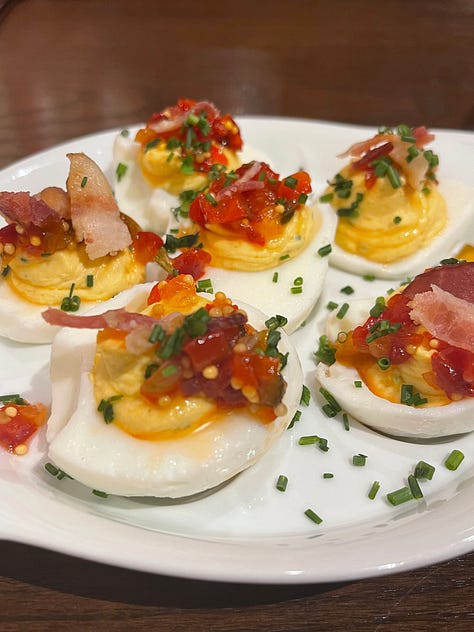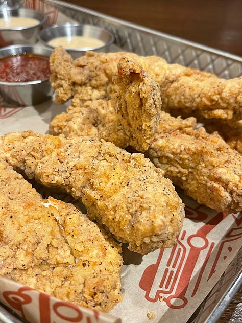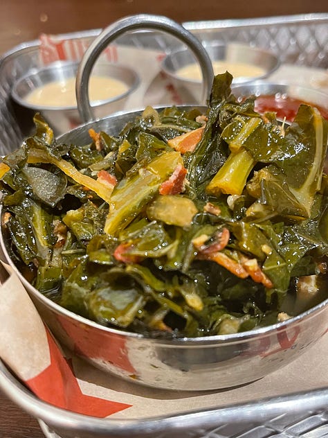 Inside the Stanley Hotel complex you’ll find The Post (part of the Big Red F Restaurant Group which includes Side Dish Dozen member Jax Fish House & Oyster Bar). The Post is known for its chicken for good reason. The chicken tenders might be the best we’ve ever had anywhere: crispy and light with no hint of grease. The hot honey chili was the perfect complement, a balanced combo of spicy and sweet. We also loved the deviled eggs, which isn’t surprising given that the lobster deviled eggs at Jax are a personal favorite. The Post’s version sports a pickled red pepper relish that adds a bright flavor pop. And let me rhapsodize about the collard greens: tangy, just a little sweet and perfectly textured. I’d go back for those alone. A half-portion could be a meal in itself. While the desserts looked amazing, we were too full to order one. But I’m planning to try the Banana Pudding Tiramisu (coffee-soaked Nila wafers, banana mascarpone custard, Oreo cookie crumble) on our next trip. Know before you go that you have to pay $10 for parking, which gives you access to wander the hotel grounds and a $5 credit toward your dining bill.