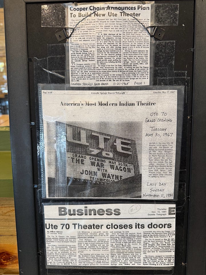 Robinson shows me several photographs of the original UTE 70 Theater that are framed together, and hang in CityROCK’s office. On the back of the frame, news clippings are taped together: articles from the Colorado Springs Free Press (dated Nov. 21, 1965) and Colorado Springs Gazette Telegraph (dated May 27, 1967 and Nov. 15, 1984). They correspond with opening and closing announcements, and are less than politically correct by today’s standards, referring to “America’s most modern Indian theatre… designed to resemble a modernistic Indian teepee.” (It debuted with a John Wayne movie in Technicolor.) The Telegraph article says the UTE 70 replaced an earlier Ute Theater, built in 1935. The Colorado Springs Pioneers Museum has more info on that, noting its early opulence among other interesting historical footnotes.