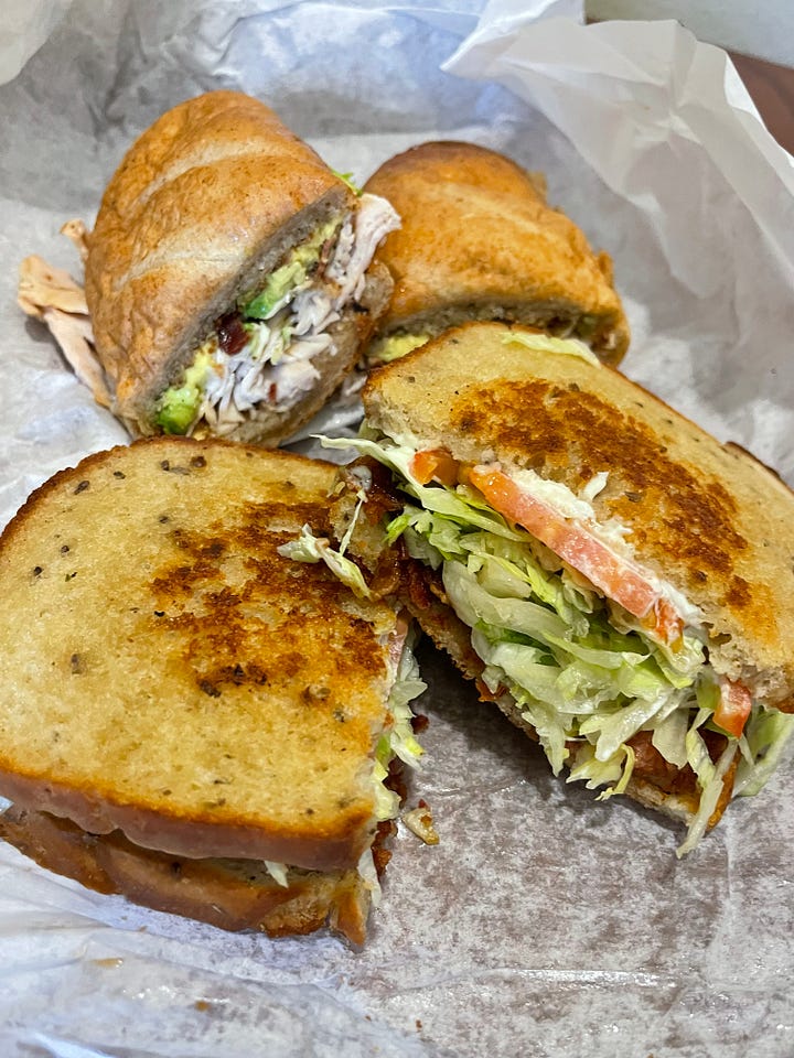Scratch Deli & Bakery is a homey, simple place serving a sizeable selection of sandwich options on your choice of house-baked bread. The Turkey Bacon Avocado on honey wheat is solid, with roasted turkey instead of deli meat, and dressed with a not-too-spicy sriracha aioli. The BLT on toasted rye is the one we’re still thinking about: crisp bacon, crunchy toast and fresh lettuce and tomato. On the preset menu the BLT is served on focaccia, but we lucked into the rye experience because focaccia was sold out by the time we got there. Now we wouldn’t order it any other way.