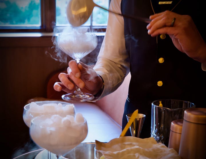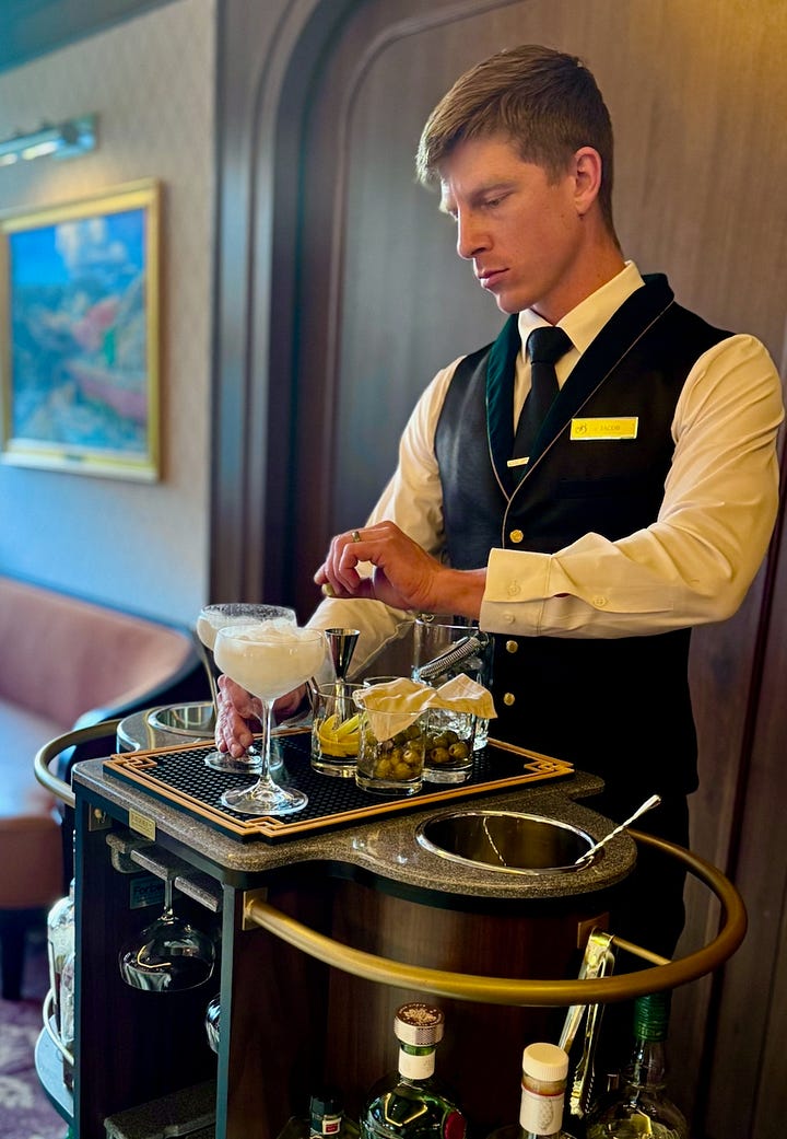 Smith chills glassware while serving from a tableside cart, making martini variations by request.