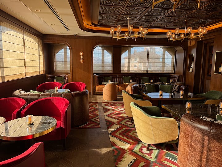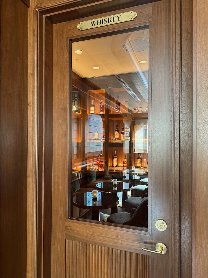 To the right of the entryway you'll find the bar/lounge area with truly spectacular West-facing views across the Broadmoor's property. Area rugs have a Pendleton/Southwest design that remind me of the Southwestern/Art Deco mashup at The Colorado Springs Fine Arts Center at Colorado College. That building also holds a history tied to Julie Penrose, who donated the land where it is situated. Peer through windows in the lounge into a climate-controlled wine and whiskey room, and you'll see rare, allocated whiskies, such as Pappy Van Winkle 23-year family reserve.