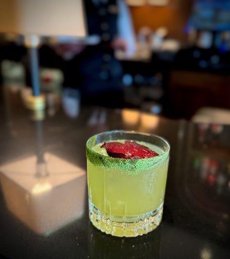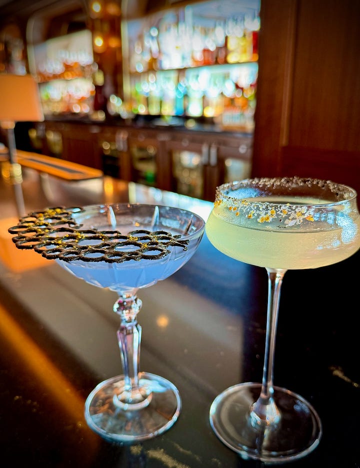 Here's a fun scavenger hunt for you: Find the original piece of artwork on display in a prominent space at The Broadmoor which informs the template on this edible drink garnish. The cocktail is named the Broadmoor Clover Club, and is made with Breckenridge gin, Cocchi Americano, raspberry, lemon and egg white. On the right, the taller glass holds the Top Floor Margarita, made with Don Julio blanco, 400 Conejos Mezcal, lime, agave and honey with a black lime and yuzu salt rim garnish. The Seafarer is made with coconut fat-washed Roku gin, cashew cherry blossom and blue spirulina for coloring. The decorative tuile is made with coconut oil, rice flour, charcoal and orange dust and intended to evoke sea foam.All cocktails are $24.
