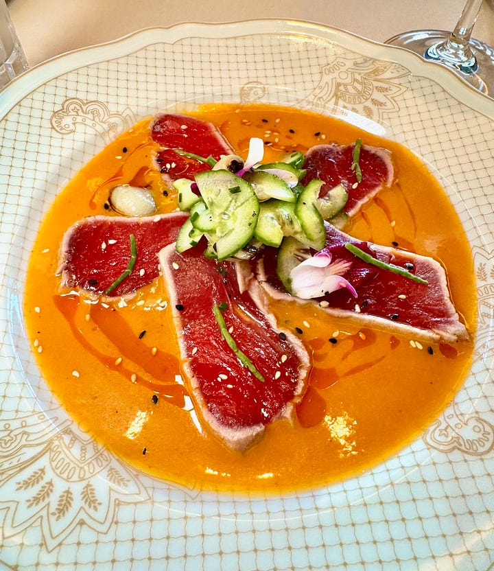 Say what? There's sushi now? Yes, we were treated to samples of several rolls, including my favorite, the Eagles Nest Ranch Wagyu Beef Tataki Roll, with tempura asparagus, horseradish crema, scallion, cherry blossom shoyu reduction. On the left: the tuna tataki, with aji amarillo and soy sauce, charred onion and Persian cucumber relish.
