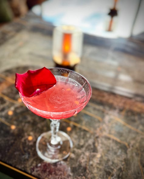 Left and middle: The PenRose, with Purkhart Pear Williams Eau-de-Vie brandy, Cocchi Rosa Pomegranate, lime and rose petal garnish. Right: the Inari Sour with Kikori Whiskey, yuzu, lemon, matcha and matcha garnish.